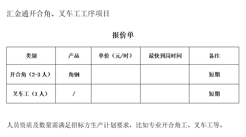 8、人員資質(zhì)及數(shù)量需滿足招標(biāo)方生產(chǎn)計(jì)劃要求,比如專業(yè)開合角工、叉車工等;