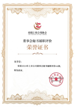 公司董事會秘書榮獲中國上市公司協會“2024上市公司董事會秘書履職評價”4A評級。